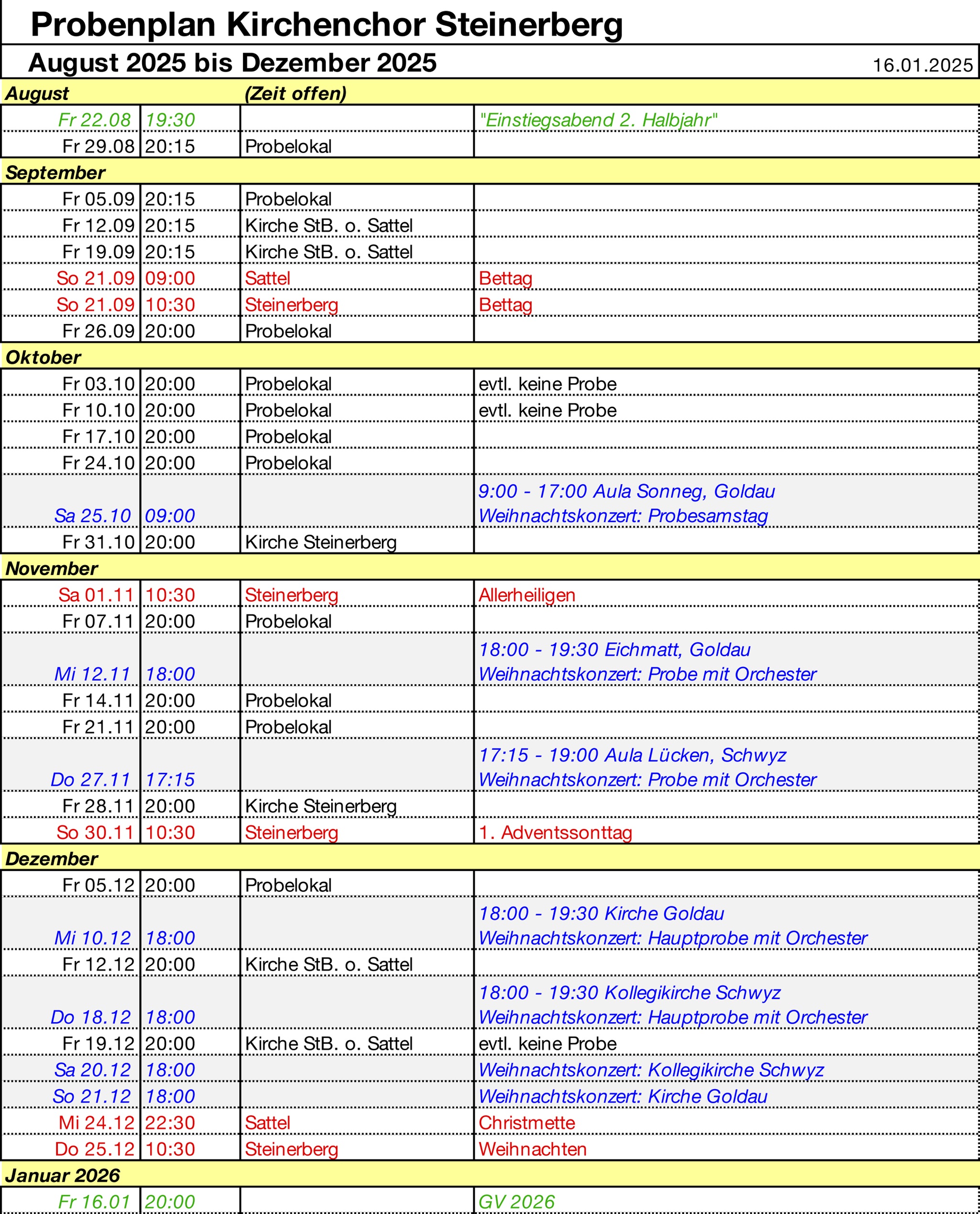 Chorprobe ist immer am Freitag von 20:00 bis 21:45 in der Aula Steinerberg