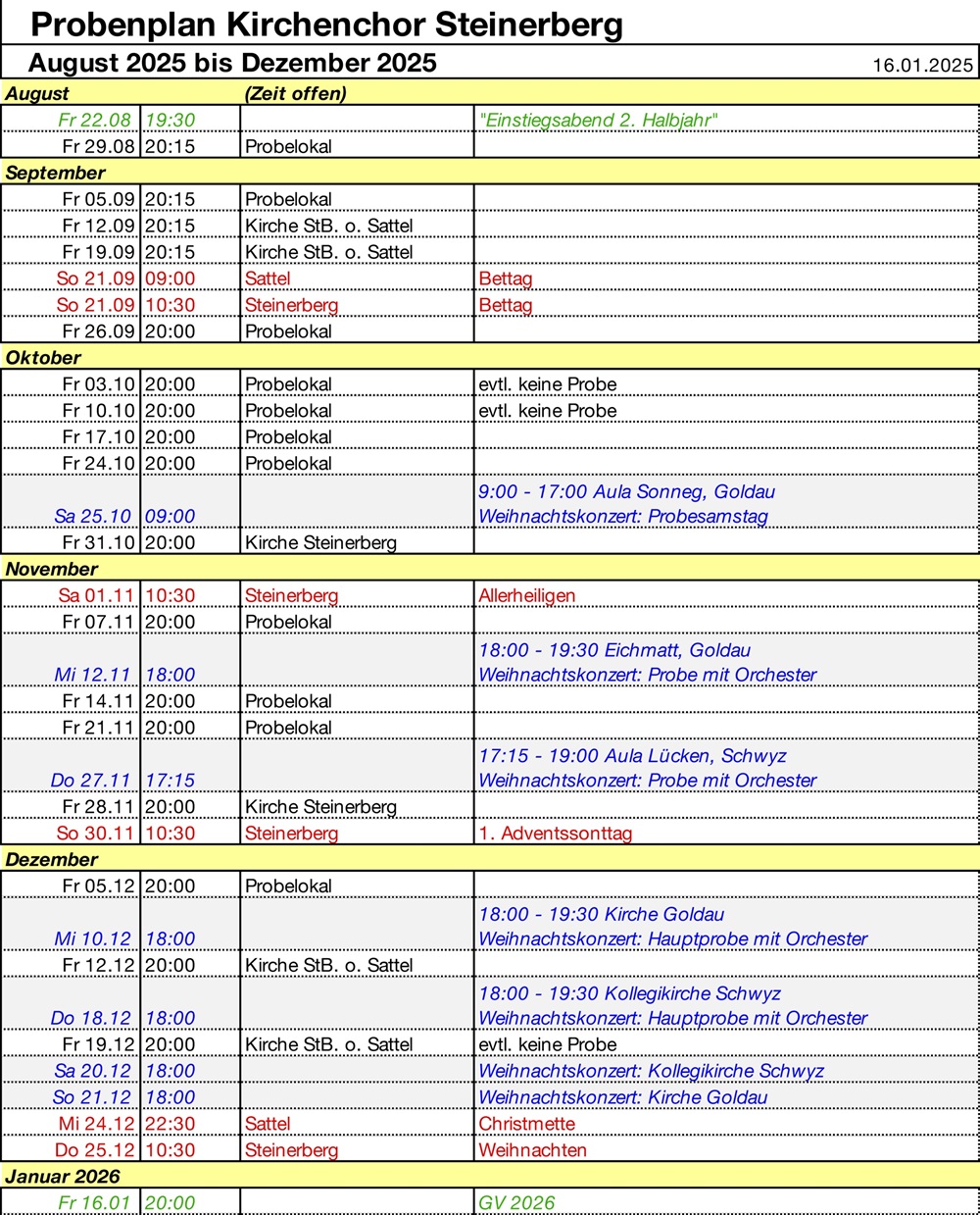 Chorprobe ist immer am Freitag von 20:00 bis 21:45 in der Aula Steinerberg